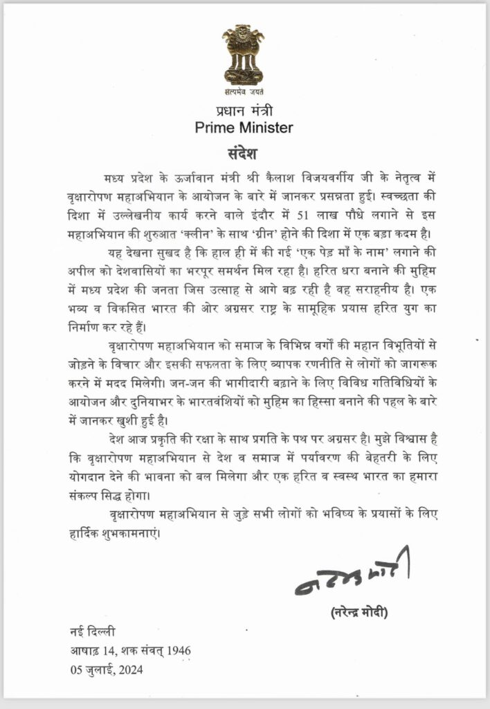पीएम मोदी ने पत्र में लिखा, मध्यप्रदेश के ऊर्जावान मंत्री श्री कैलाश विजयवर्गीय जी के नेतृत्व में वृक्षारोपण महाअभियान के आयोजन के बारे में जानकर प्रसन्नता हुई। स्वच्छता की दिशा में उल्लेखनीय कार्य करने वाले इंदौर में 51 लाख पौधे लगाने से इस महाअभियान की शुरुआत क्लीन के साथ ग्रीन होने की दिशा में एक बड़ा कदम है।