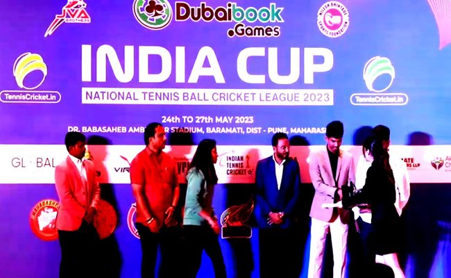 डॉ पी वी शेट्टी, क्रिकेटर जेमिमा रोड्रिग्स द्वारा इंडिया कप नेशनल टेनिस बॉल क्रिकेट लीग 2023 की ट्रॉफी का अनावरण