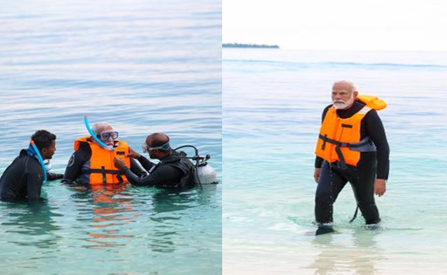 समुद्र किनारे कुर्सी पर बैठे दिखे पीएम मोदी, लक्षद्वीप के नीले पानी में की स्नॉर्केलिंग
