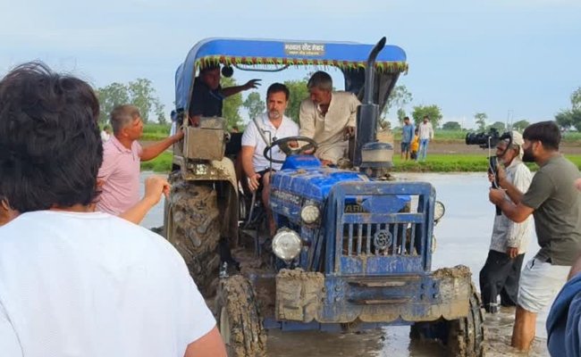 सोनीपत में राहुल गांधी ने किसानों के साथ की खेतों में धान की रोपाई, चलाया ट्रैक्टर