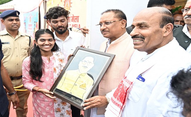 दिव्य कला मेला में मुख्यमंत्री श्री साय को पैरा शिल्प से निर्मित पोर्ट्रेट भेंट की गई