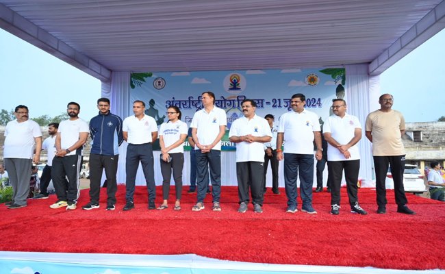 दशम अंतरर्राष्ट्रीय योग दिवस पर रविशंकर स्टेडियम दुर्ग में आयोजित योगा कार्यक्रम में शामिल हुए उप मुख्यमंत्री श्री विजय शर्मा