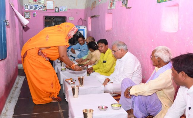 मुख्यमंत्री श्री भूपेश बघेल ने ग्राम कडार निवासी किसान श्री ढेलुराम साहू के घर स्वादिष्ट छत्तीसगढ़ी व्यजंनों का चखा स्वाद