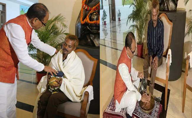 सीएम शिवराज ने सीधी पेशाब कांड के पीड़ित आदिवासी दशमत के पांव धोकर, आरती उतारी, मांगी माफी