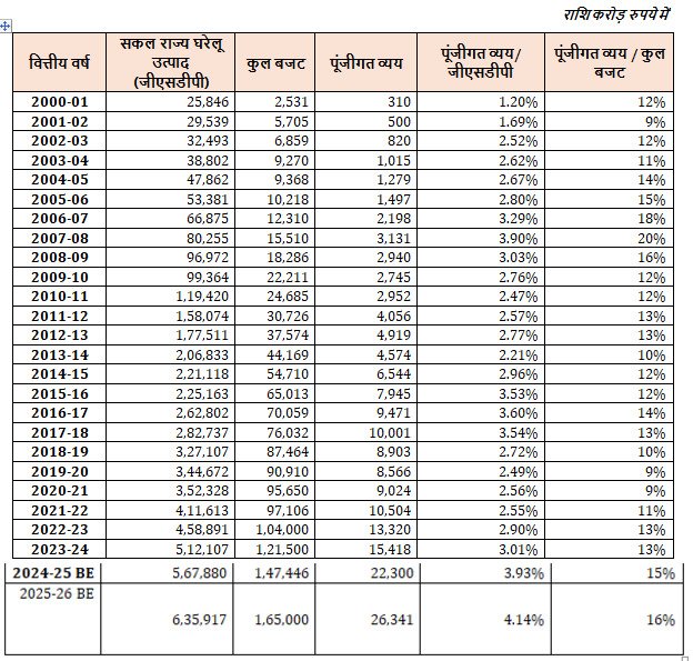 वित्त वर्ष 2025-26 के लिए राज्य का पूंजीगत व्यय लगभग 26,341 करोड़ रुपये प्रस्तावित है, जो कुल बजट का 16% और राज्य के सकल घरेलू उत्पाद का 4.14% है। राज्य के गठन के बाद यह पहली बार है कि राज्य ने इस उपलब्धि को हासिल किया है।
