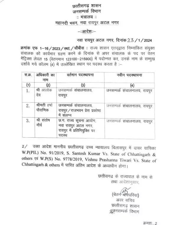 रायपुर। छत्तीसगढ़ जनसंपर्क विभाग के तीन अधिकारी संयुक्त संचालक से अपर संचालक प्रमोट हुए हैं। जनसंपर्क डायरेक्टरेट में पोस्टेड आलोक देव, हर्षा पौराणिक एवं संतोष मौर्य को संयुक्त संचालक से अपर संचालक पद पर पदोन्नति प्रदान की गई है। राज्य शासन ने जनसंपर्क विभाग के अधिकारियों के पदोन्नति एवं नवीन पदस्थापना आदेश जारी किया है।