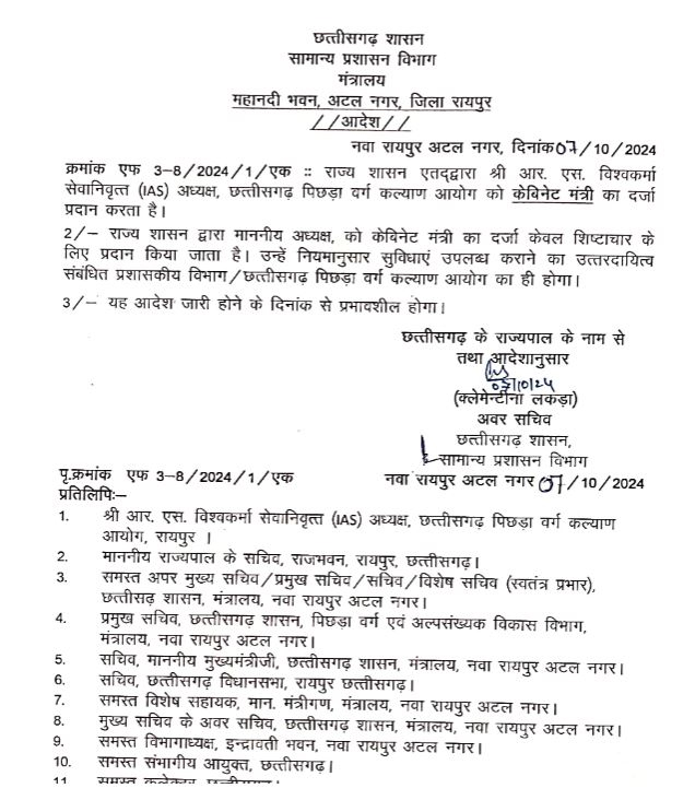 इस संबंध में जारी आदेश के अनुसार रिटायर्ड आईएएस आरएस विश्वकर्मा को कैबिनेट मंत्री का दर्जा दिया गया है। आदेश में यह भी स्पष्ट किया गया है कि अध्यक्ष को कैबिनेट मंत्री का दर्जा केवल शिष्टाचार के लिए दिया जाता है। उन्हें नियमानुसार सुविधाएं उपलब्ध कराने का उत्तरदायित्व संबंधित प्रशासकीय विभाग/ राज्य पिछड़ा वर्ग कल्याण आयोग का होगा।